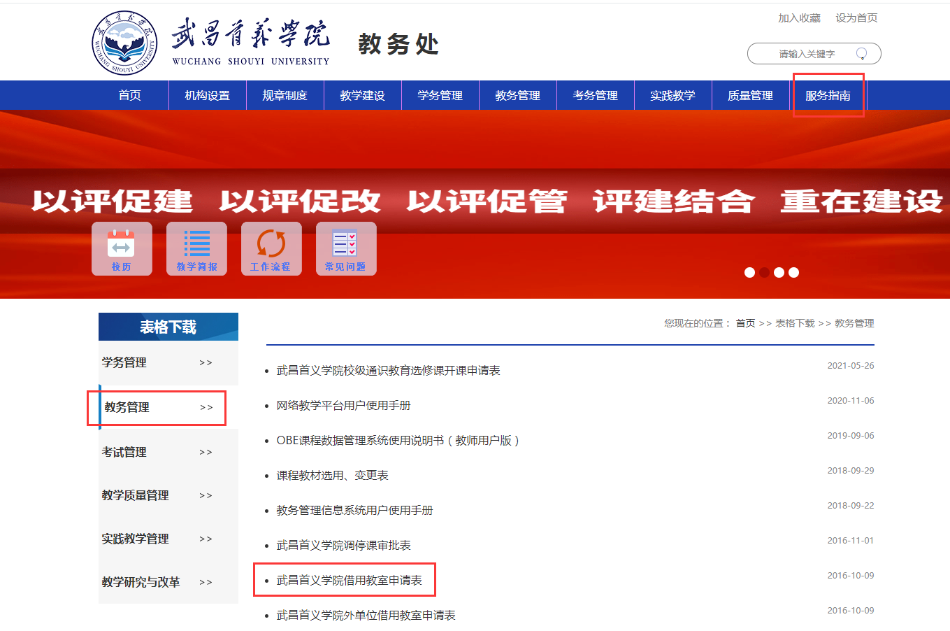 答:教务处网站(http://jwc.wsyu.edu.cn/)“服务指南”-“表格下载”-“教务管理”栏中下载、打印并填写《武昌首义学院借用教室申请表》。