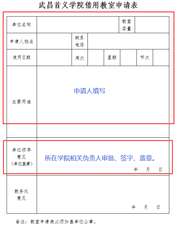 2、问:《武昌首义学院借用教室申请表》须填写哪些内容?