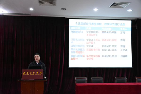 李桂兰副校长介绍,第三次教学工作会议开幕以来,学校围绕“优化学科专业结构和人才培养机制,培养高素质本科应用型人才”的主题,运用专业论证的评价要求和方法,开展专业建设工作。今年暑期前后,学校选取机电院机械电子工程、自动化、电气工程三个专业分两轮进行了OBE的人才培养模式建构的试点研究工作。三个专业联合思政课部、基科部、外语系,克服重重困难,努力探索研究,现已取得初步成果。机电院6位教师代表将围绕该项工作的开展情况分别作专题汇报。