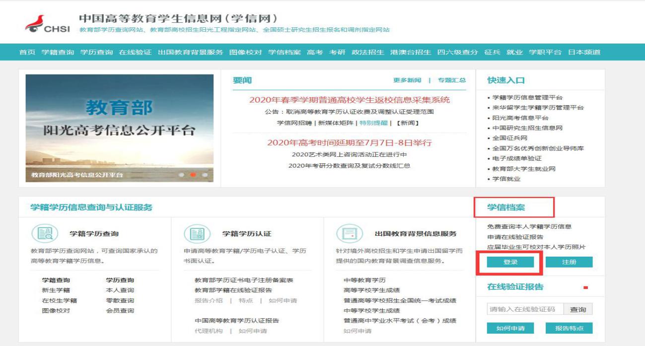 1、进入学信网打开界面进入“学信档案”,点击“登录”。