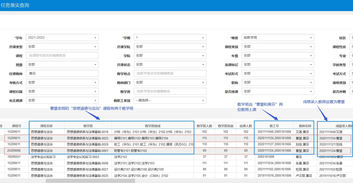 课程和教学班信息默认在负责课程成绩录入那位老师(由教务员在落实教学任务时指定)名下,非成绩录入教师名下是无开课信息的。若非成绩录入教师