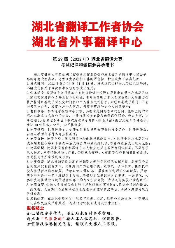 郑重提示:所有参赛选手需在线阅读并在报名时签订“诚信参赛承诺书”(见附件);线上报名请务必从微信公众号“第29届湖北省翻译大赛”或“湖北省翻译工作者协会”官网进入报名系统。